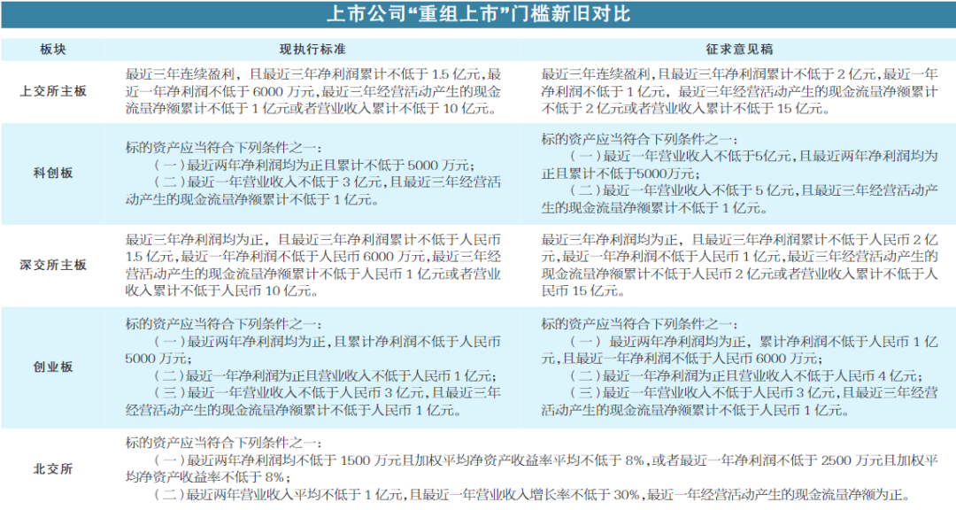 对照主板上市条件(IPO门槛)的修改,上交所提高了主板重组上市条件,要求标的资产应当符合:最近三年连续盈利,且最近三年净利润累计不低于2亿元,最近一年净利润不低于1亿元,最近三年经营活动产生的现金流量净额累计不低于2亿元或者营业收入累计不低于15亿元。